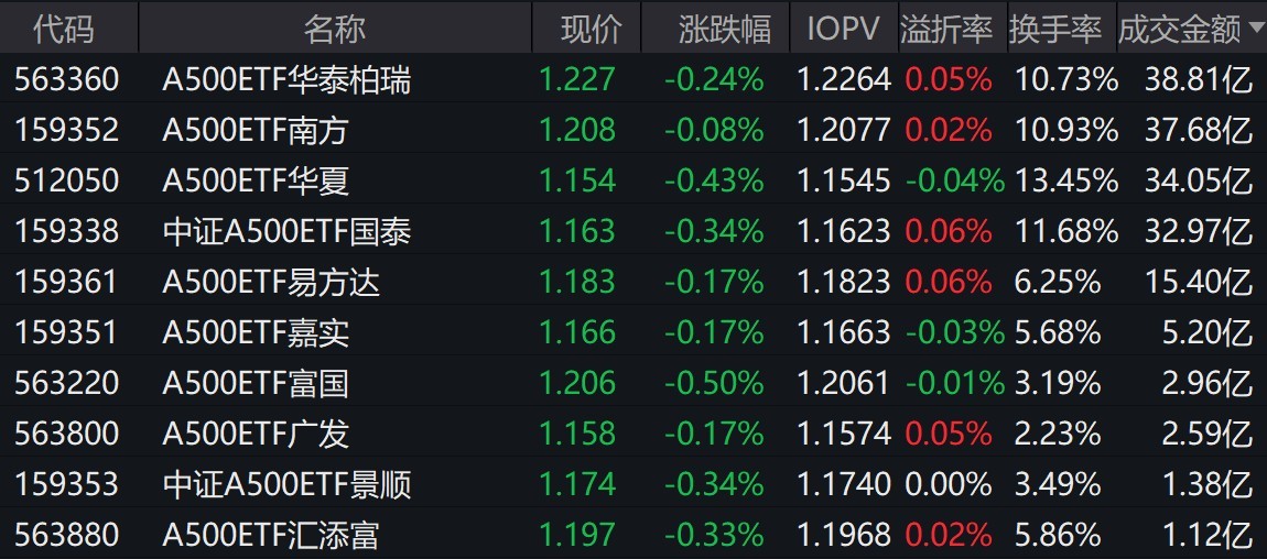 截至上午收盘,场内跟踪中证A500指数的ETF小幅下跌。其中,有10只中证A500相关ETF成交额超1亿元,2只超37亿元。A500ETF华泰柏瑞、A500ETF南方早盘成交额分别为38.81亿元、37.68亿元。