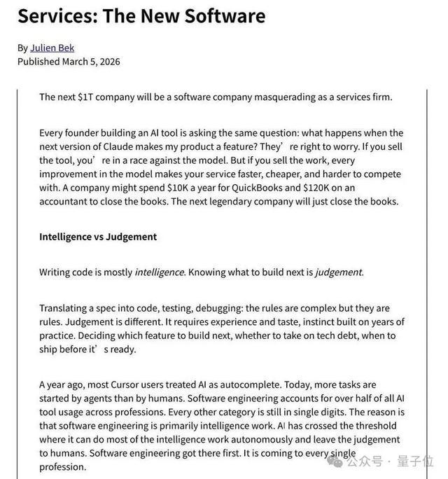 红杉合伙人Julien Bek在其文章“Service is the new software”(服务即新软件)中提出: